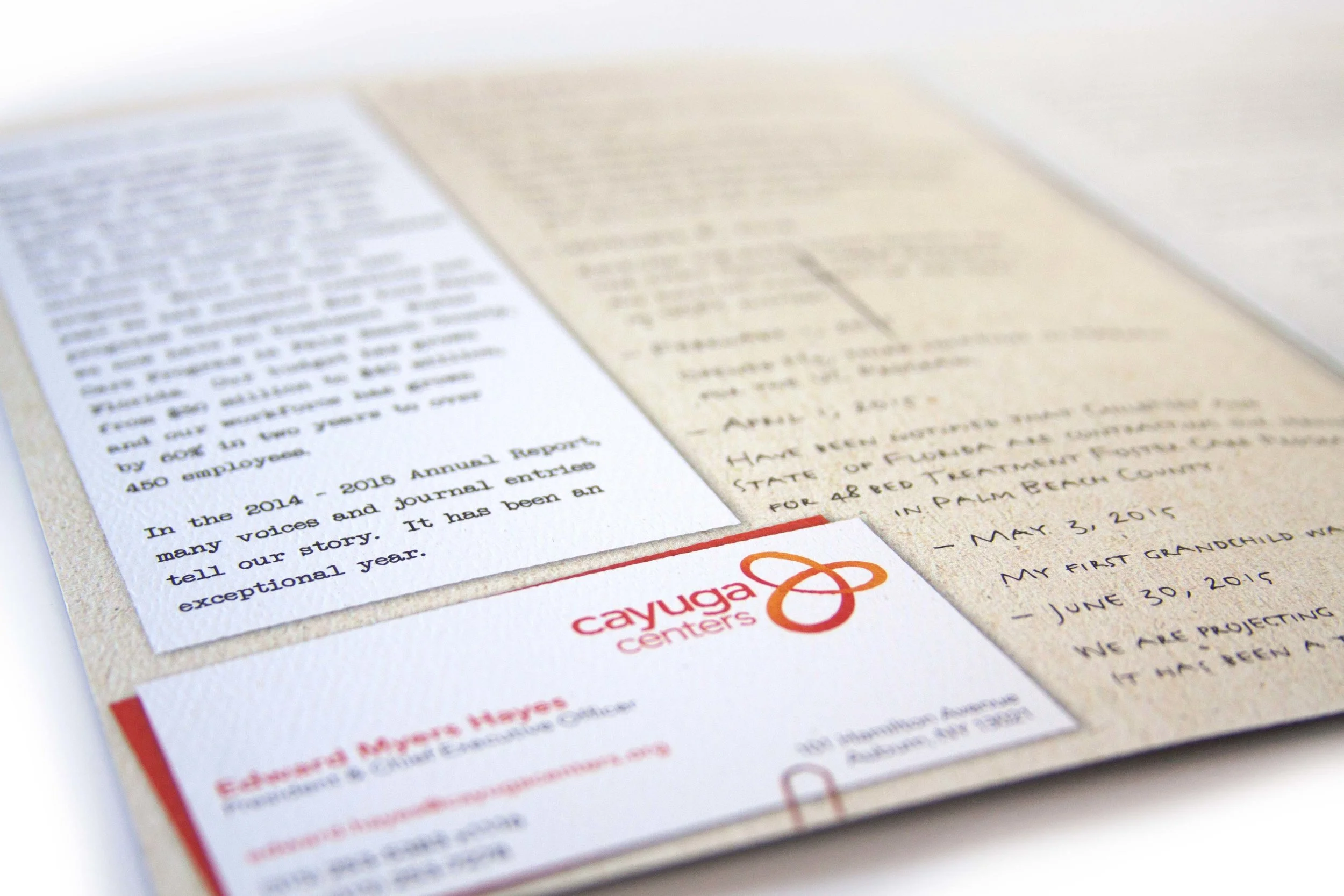 Orange was chosen to represent the positive impacts Cayuga Centers steadfastly strives for. The logo, which was created as a unified flowing mark, represents the ideals of evolution and togetherness. The colors and mark are easily integrated throughout all pieces, seamlessly branding Cayuga Centers.